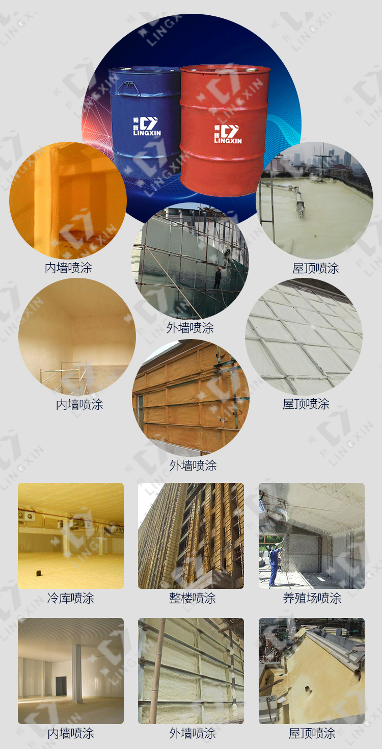 Spray coating is designed for civil cold storage, bus ceiling, building roof and arch building and made of insulation materials, flexible and convenient construction. The B component is isocyanate. Component A is composed of polyether polyol, foaming agent, catalyst, foam stabilizer and other raw materials. Spraying technology: black and white materials are heated and pressurized through the spraying machine, forming a high pressure impact in the spray gun, forming a vortex mixing is very full. High-speed movement of the material at the nozzle to form a fine mist droplets, uniform spray to the surface of the object.